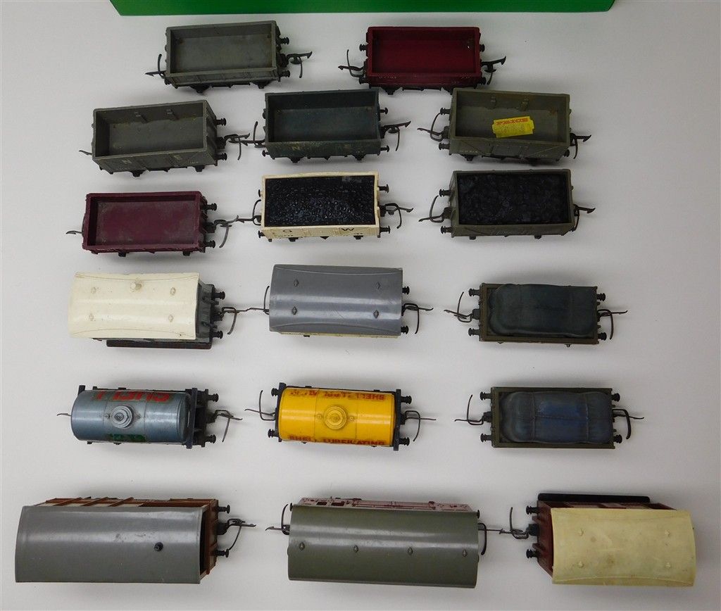 17 assorted Tri-ang 4 wheel wagons with MkII couplings on metal chassis with deep flanged wheels so not suitable for Hornby/Peco track, open axle boxes, some incomplete/damaged, in fair condition but needs a clean, no original boxes