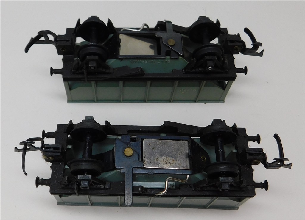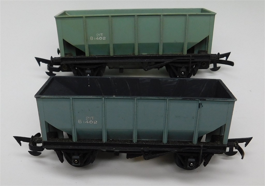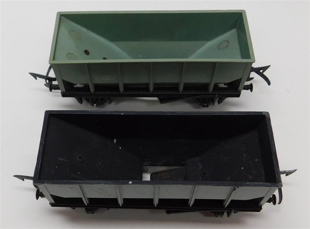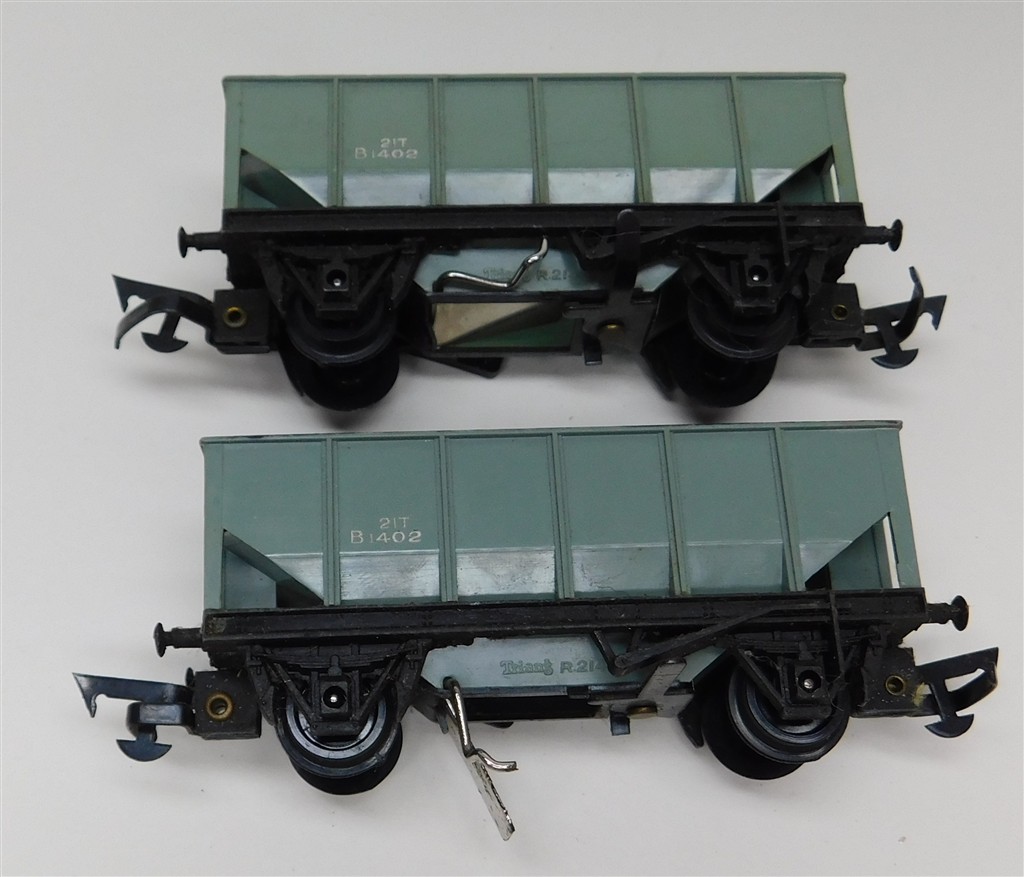 2 Tri-ang 4 wheel operating hopper wagons with MkII couplings on metal chassis with deep flanged wheels so not suitable for Hornby/Peco track, open axle boxes, one repainted, in fair condition but needs a clean, no original boxes