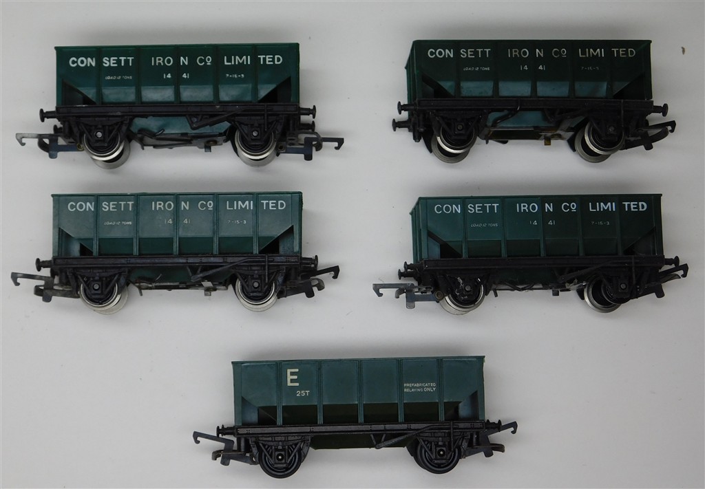 00 Wagons: 5 Tri-ang Hornby green hopper wagons with MkIII couplings, 4 Consett, 1 Engineering Dept