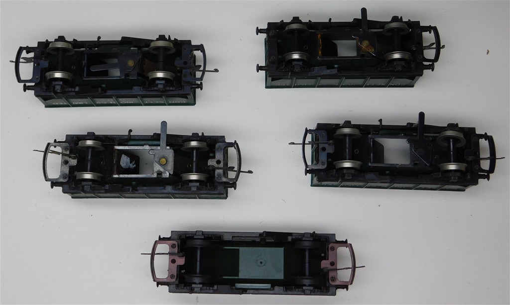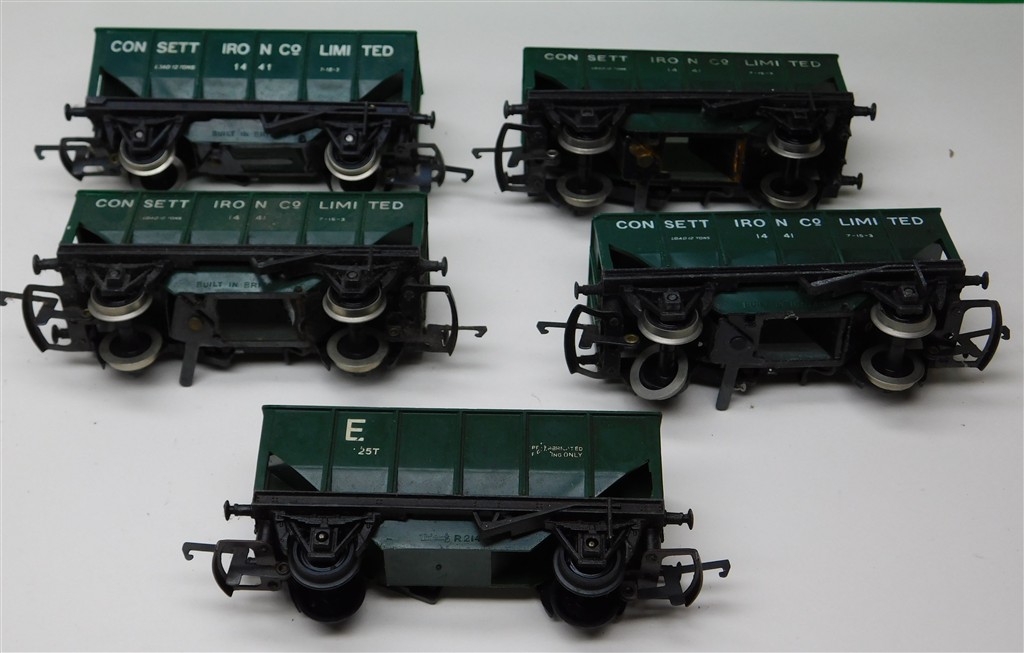 5 Tri-ang Hornby green hopper wagons with MkIII couplings, 4 Consett, 1 Engineering Dept, on metal chassis with deep flanged wheels so not suitable for Hornby/Peco track, open axle boxes, the engineering hopper is non-operating, some loose wheel rims, rusty operating mechanisms, one chipped corner, one missing coupling, in fair condition but needs a clean, no original boxes