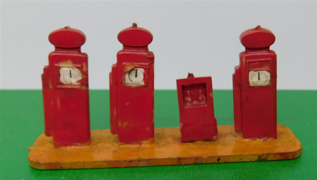 A plastic 00 gauge trio of petrol pumps, make unknown