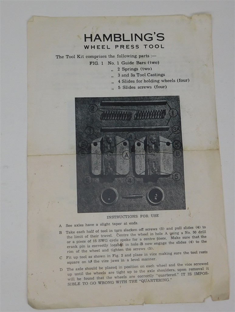 A Hamblings Wheel Press Tool instruction sheet, in fair condition