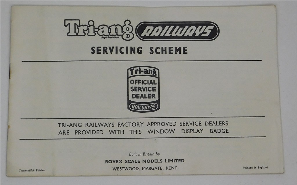 A 25th edition of the Tri-ang servicing scheme listing all of the official service dealers approved by Tri-ang, in good used condition with some rust marks and folds.