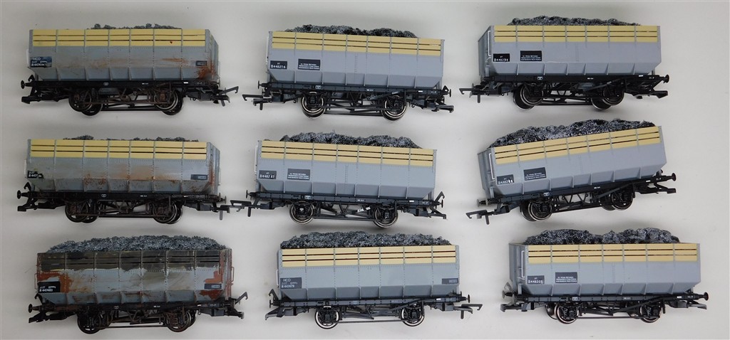 00 Wagons: 9 assorted renumbered/weathered Hornby 21T coke hopper wagons