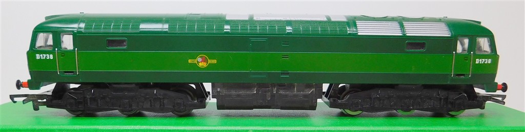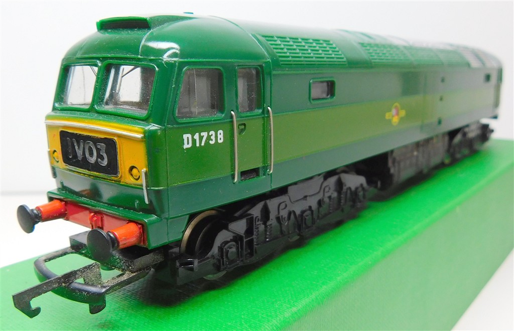 A mid 1970s production Hornby BR two-tone green class 47 number D1738 with directional 1V03 headcodes, good runner, in good condition, no original box.