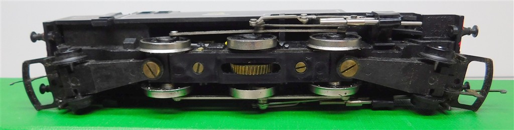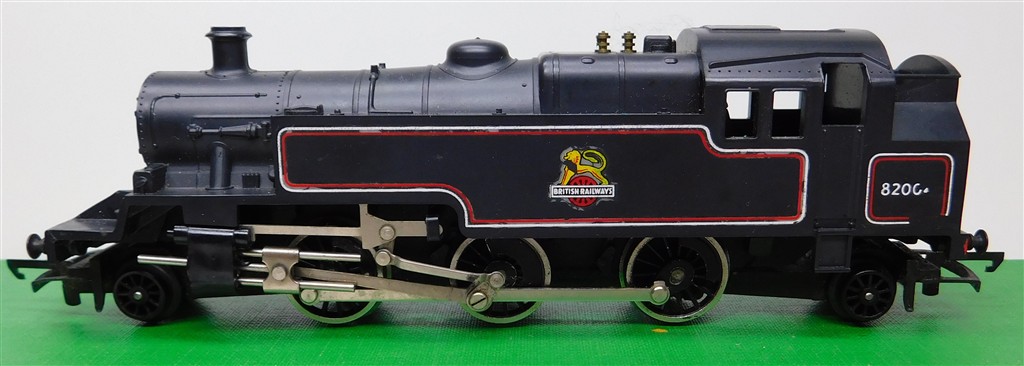 An early 1960s production Tri-ang BR black Prairie tank steam loco with changed wheels, fitted with finer-scale Hornby wheels and Mark III couplings, some lettering and lining loss, good runner, in good used condition, no original box. Please note this loco needs a controller capable of delivering at least 1A to run well, and may not like new Hornby or Peco points without changing the pony wheels.