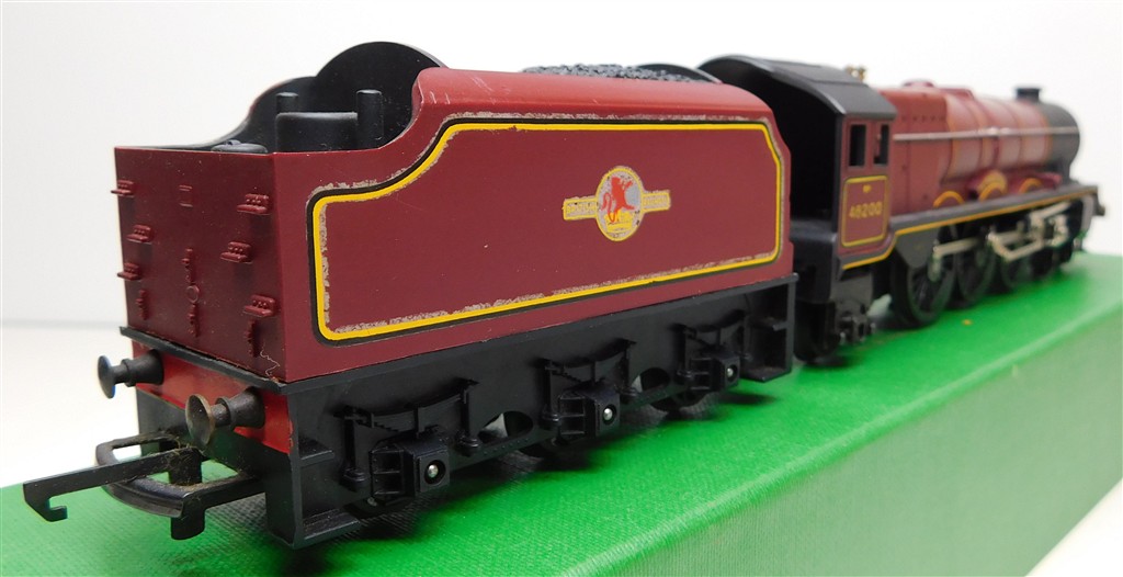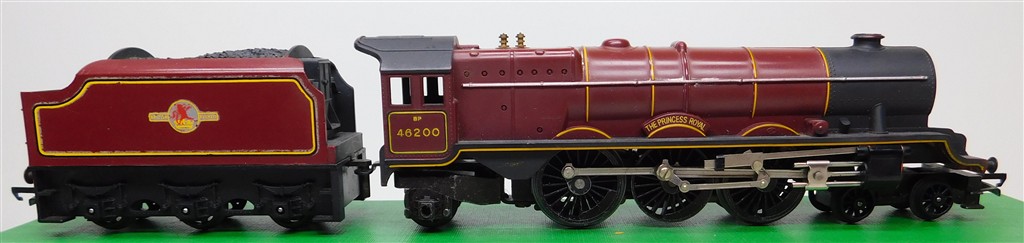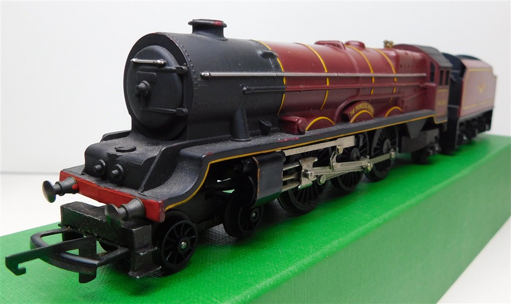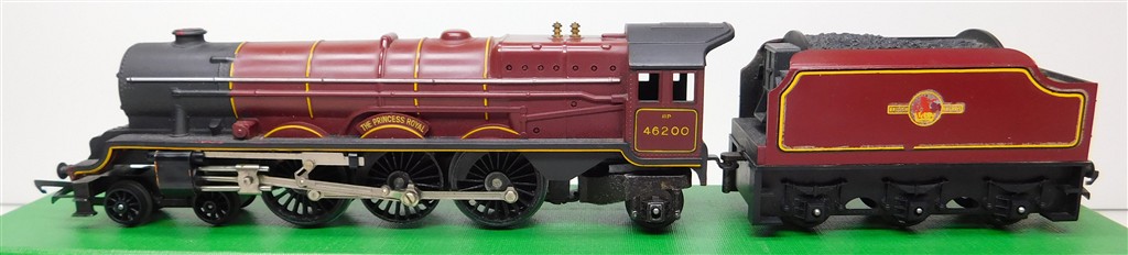 A 1960s production Tri-ang BR Maroon livery 4-6-2 steam loco 46200 Princess Royal with working smoke unit, good runner, some lining loss otherwise in good condition, no original box. Please note this loco needs a controller capable of delivering at least 600mA to run well, and doesn't like new Hornby or Peco points due to the deep flanged wheels