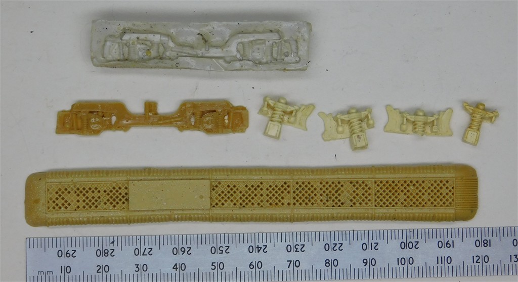 A H0 scale French bogie sideframe, rubber mould, roof casting etc, type unknown