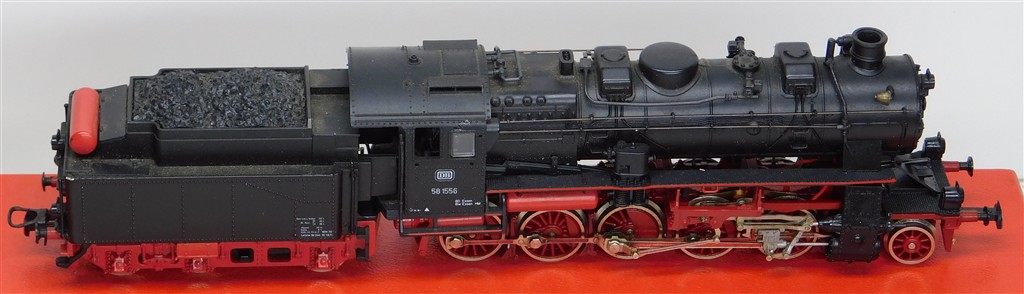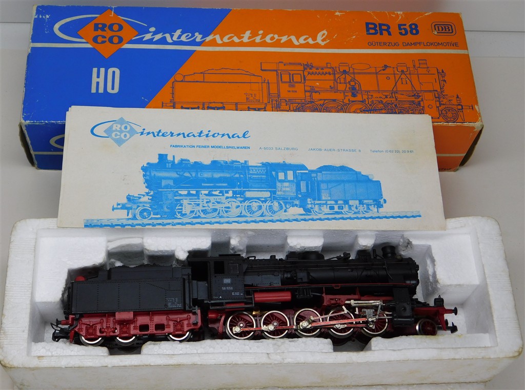 A Roco 4112 German DB class 58 steam loco number 58 1556, good if noisy runner with directional head lights, missing cylinder end rods otherwise in good used condition, needs a clean, supplied in the original box
