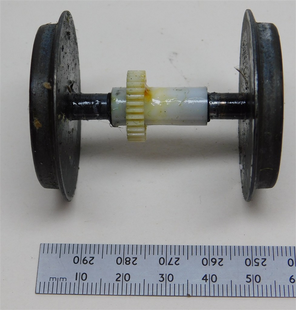 4 axles G scale 38mm diameter diesel loco driving wheels, make and type unknown, ruler not included