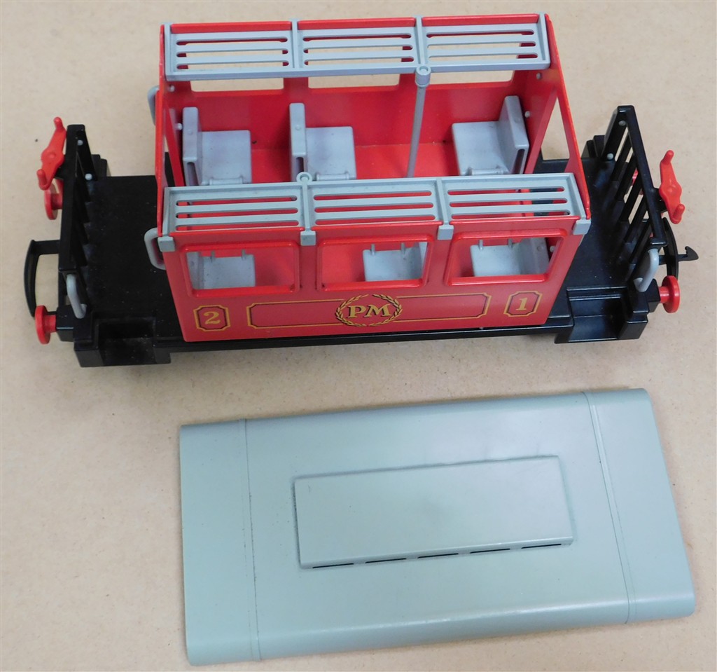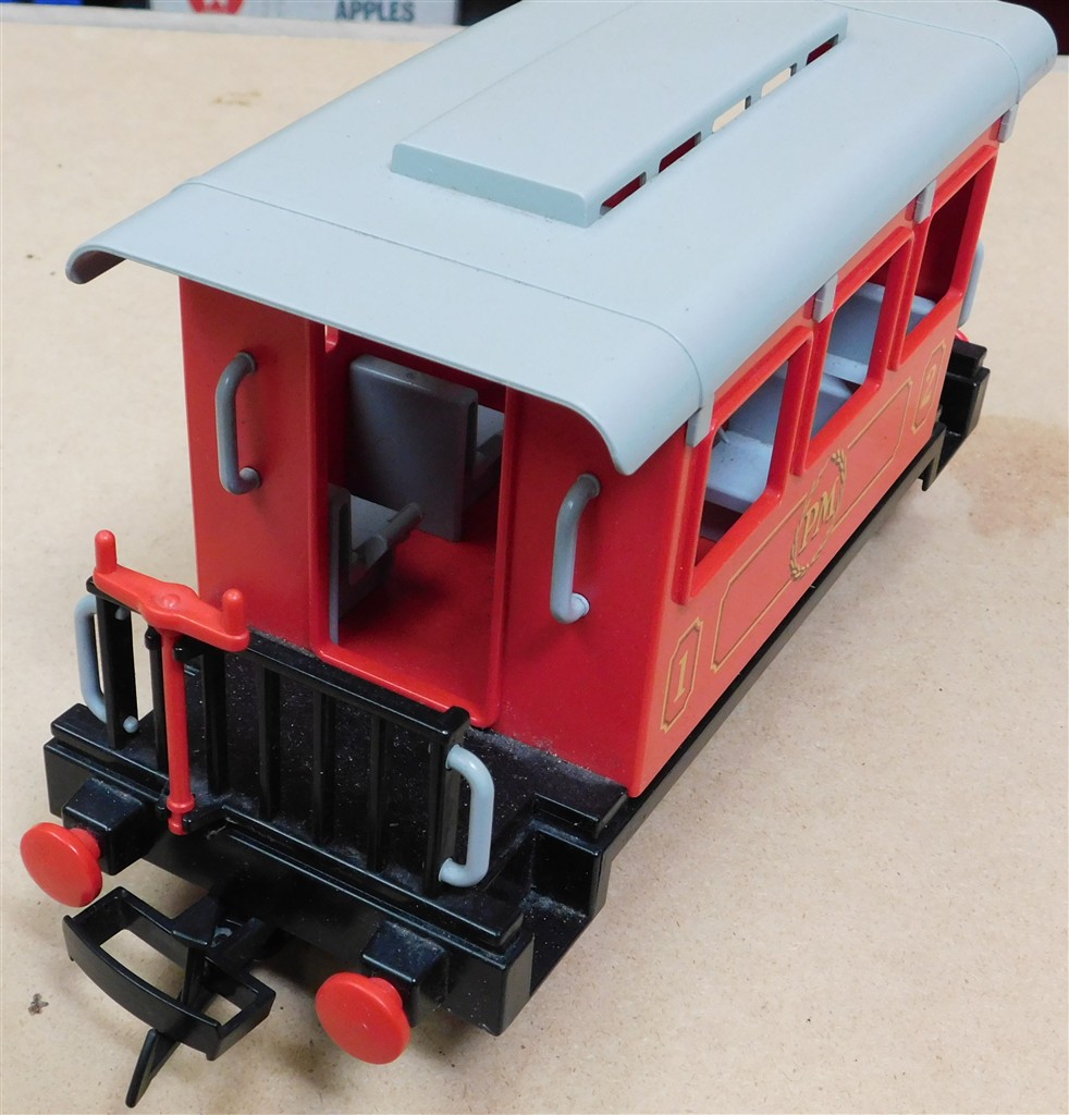 A Playmobil G scale red coach, wheels need a good clean otherwise in good condition, no original box