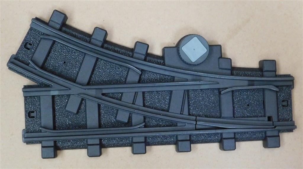 A Playmobil G scale plastic track right hand point, for the radio control system, no secondary connector included, in good used condition, no original packaging, one is missing the grey plastic square on the lever but this doesn't affect operation
