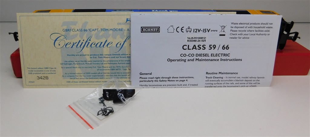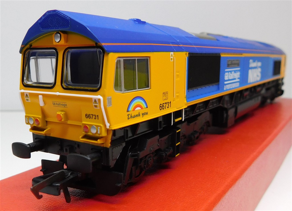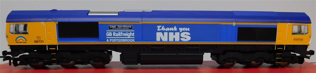 A Hornby R30069 GBRf class 66 number 66731 Sir Tom Moore, one bogie doesn't sit right, cause needs investigating and fixing, good runner, in good clean cosmetic condition, supplied in the original box, sold as a project needing work!