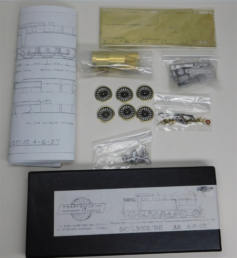 An unassembled Craftsman Models GC/LNER/BR A5 4-6-2T loco, with 6 Romford driving wheels, no axles, needs motor, pony wheels, couplings, gears, glue/solder, paint etc to complete, supplied in the original box, small parts bags not opened, a project