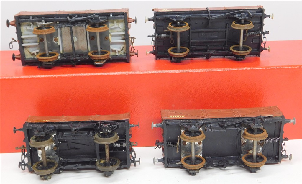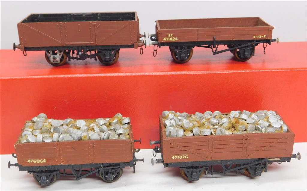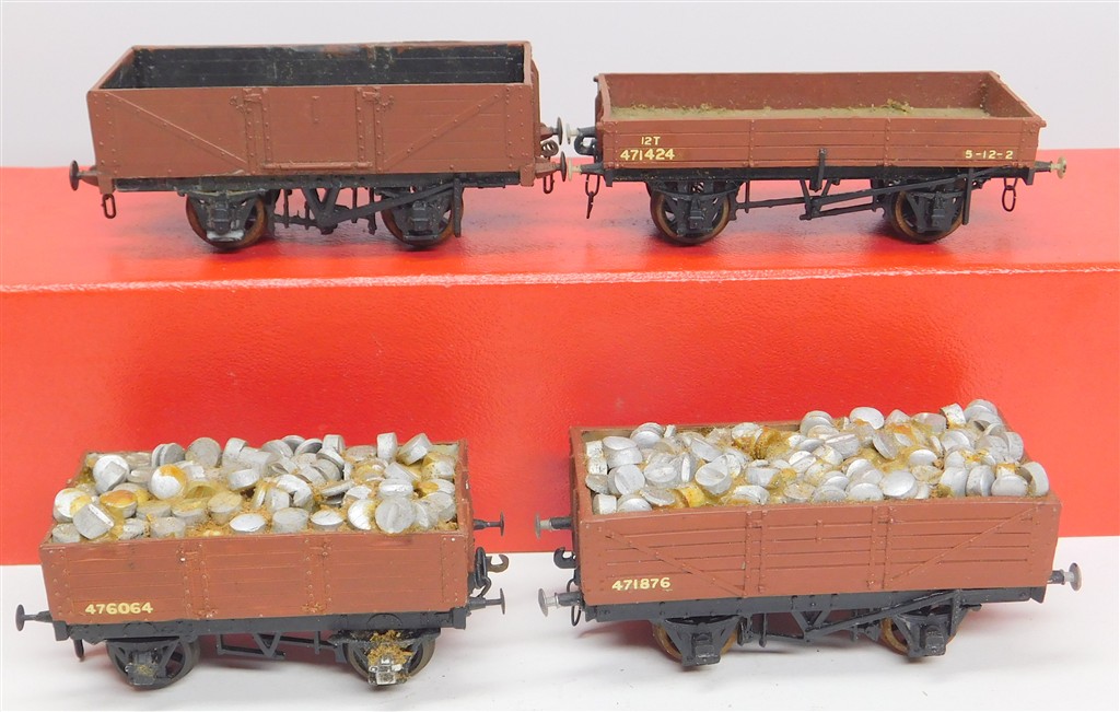 4 kitbuilt open wagons, various types, two with a load, needs a clean, with three link couplings and rusty wheels, no original boxes