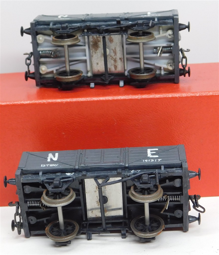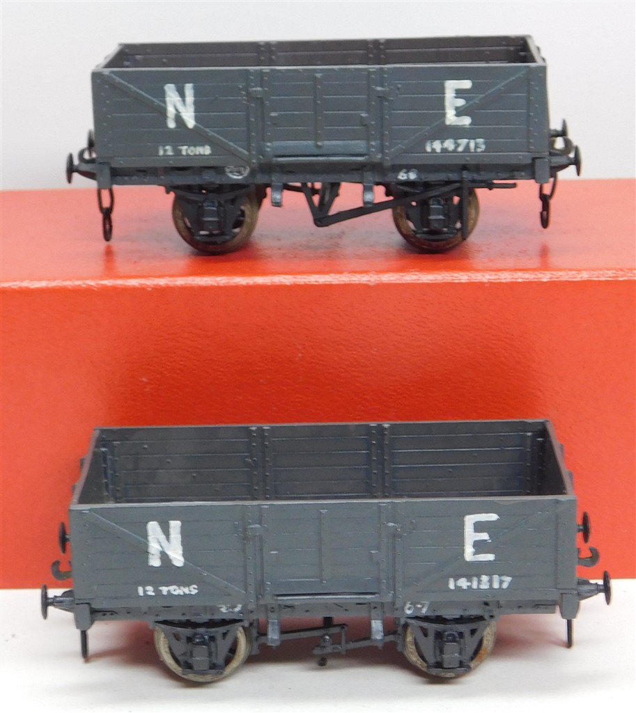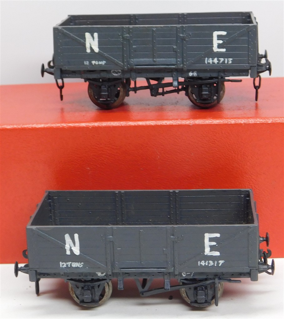 2 kitbuilt hand lettered NE open wagons, make unknown, needs a clean, with three link couplings and metal wheels, no original boxes