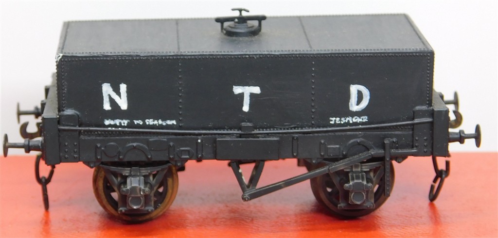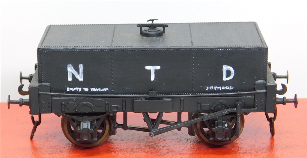 A kitbuilt hand lettered NTD box tank wagon, make unknown, one broken buffer needs refixing, needs a clean, with three link couplings and metal wheels, no original boxes