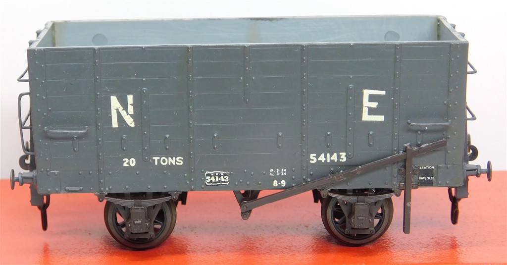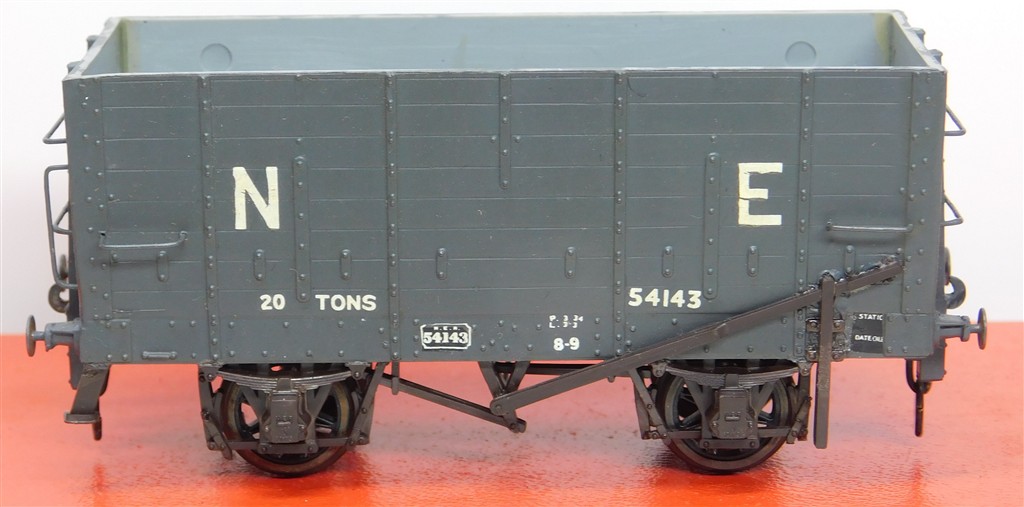 A kitbuilt hand lettered NE 20T open wagon number 54143, make unknown, needs a clean, with three link couplings and metal wheels, no original boxes