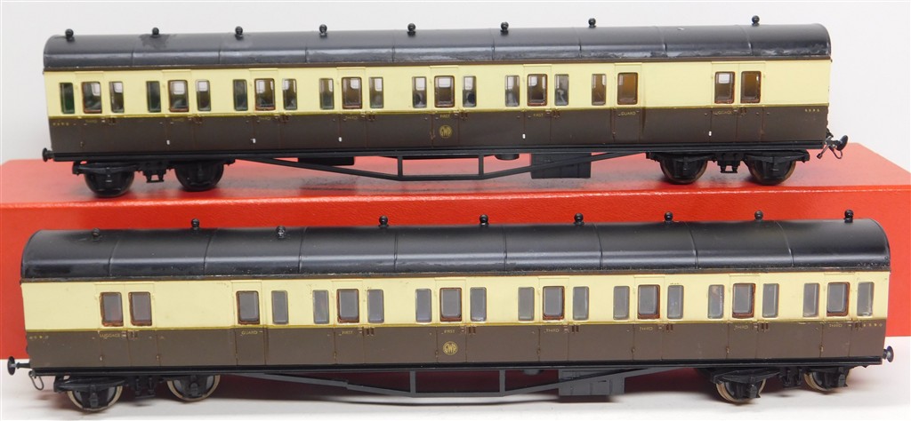 EM and P4 Gauge: Pair of Airfix GWR B unit coaches with 3 link couplings and EM gauge wheels