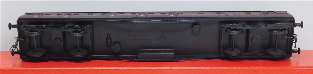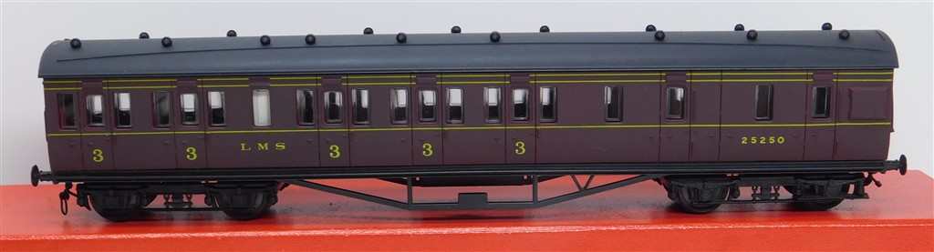 An Airfix LMS non-corridor 3rd class coach with 3 link couplings and EM gauge wheels, coupling mounts removed from the bogies, supplied in the original box, note this will not run on 00 track without changing the wheels