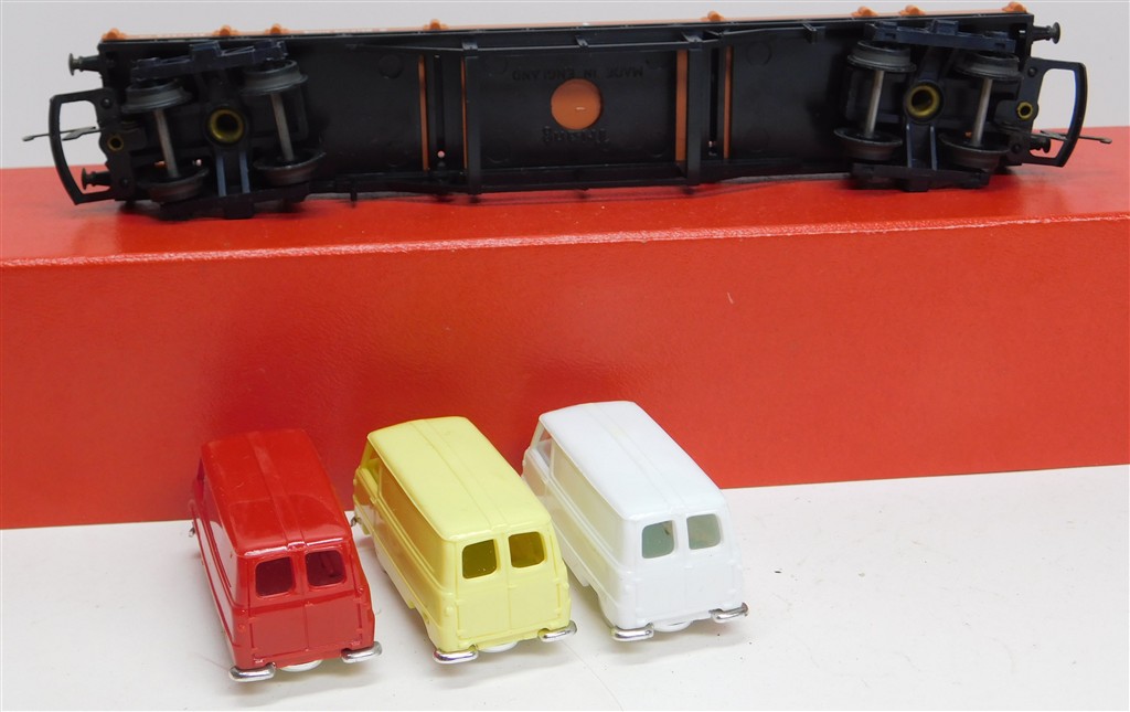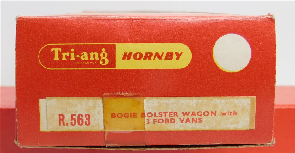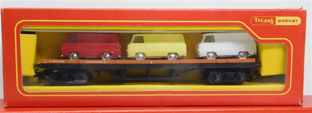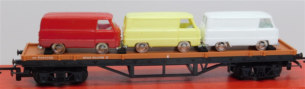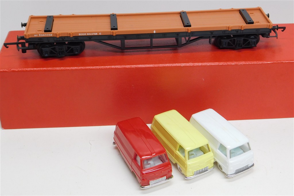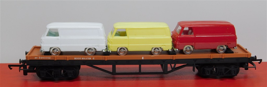 00 Wagons: Tri-ang Hornby R563 Bogie Bolster Wagon number B940052 with 3 Ford Thames Vans