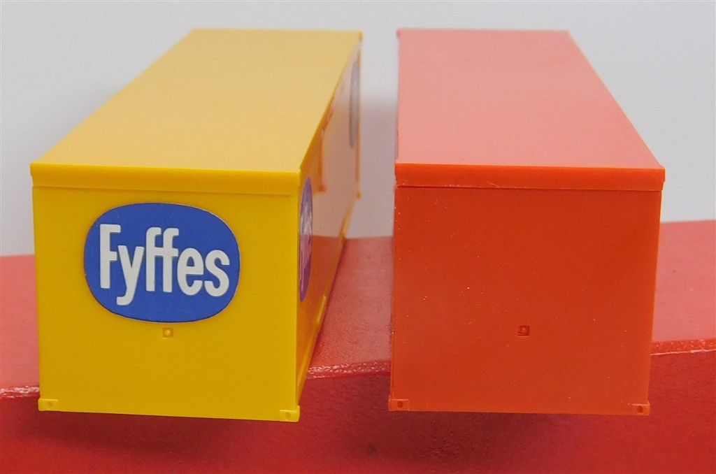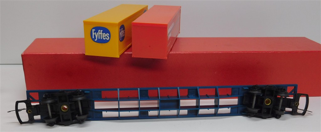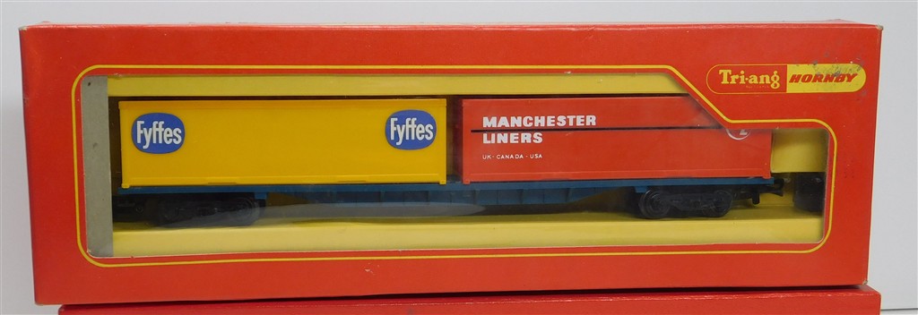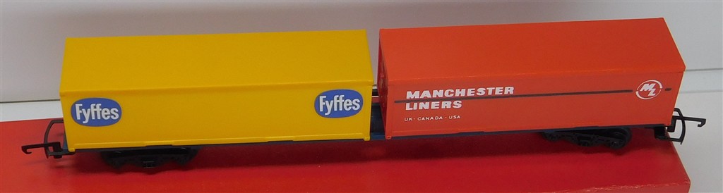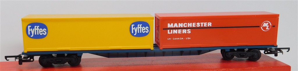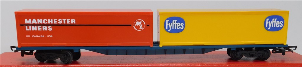00 Wagons: Tri-ang Hornby R677 Freightliner container wagon with 2 30' containers: Fyffes and Manchester Liners