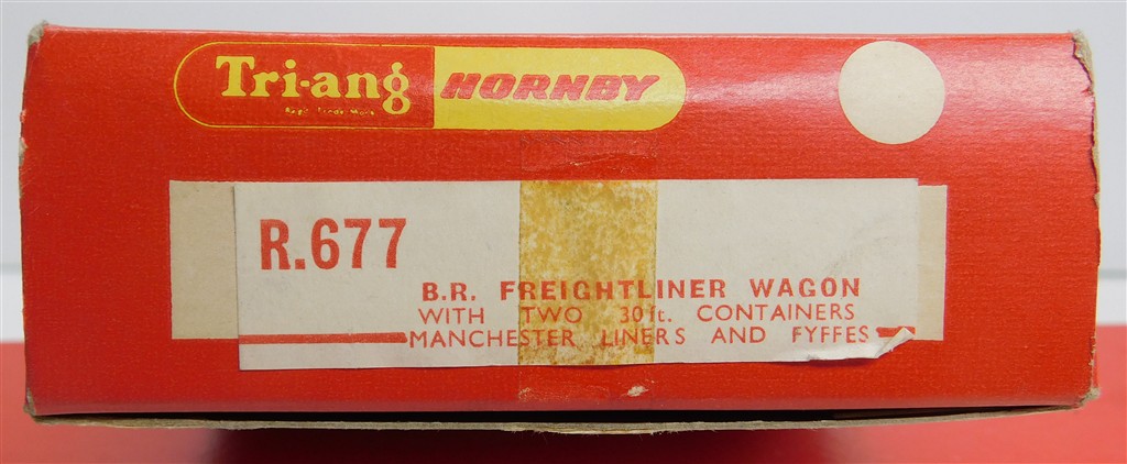 A Tri-ang Hornby R677 Freightliner container wagon with 2 30' containers: Fyffes and Manchester Liners, in good condition, supplied in the original box.