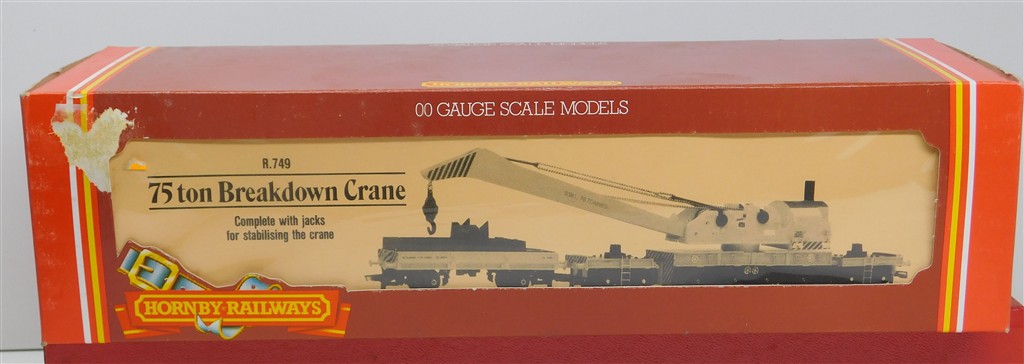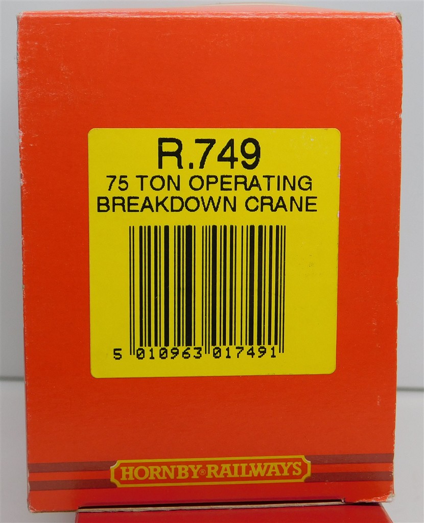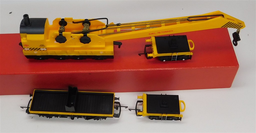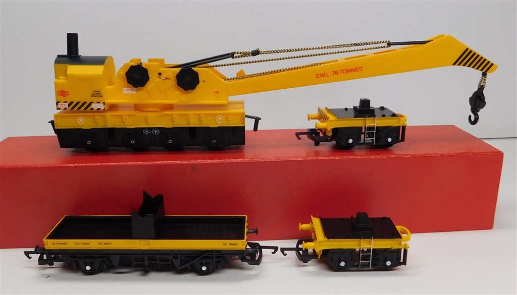 A Hornby R749 BR operating crane wagon set number DB966111, bright yellow, in very good condition, with chimney and 4 jacks, supplied in the original box.