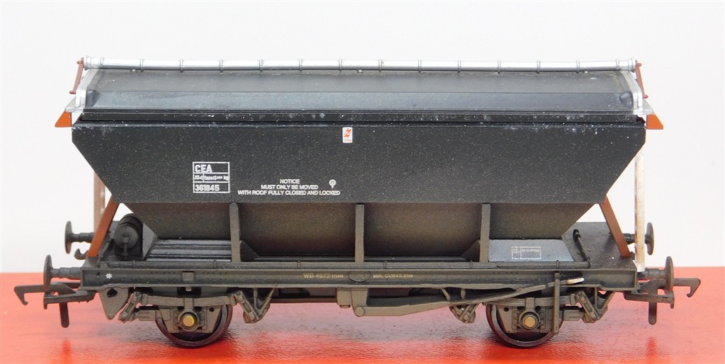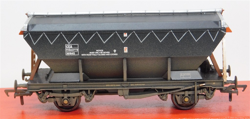 A Bachmann 38-021 covered hopper wagon type CEA number 361845, weathered, added empty load to interior, metal wheels, NEM pocket couplings, in good condition, supplied in the original box.