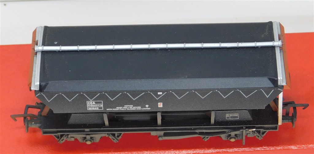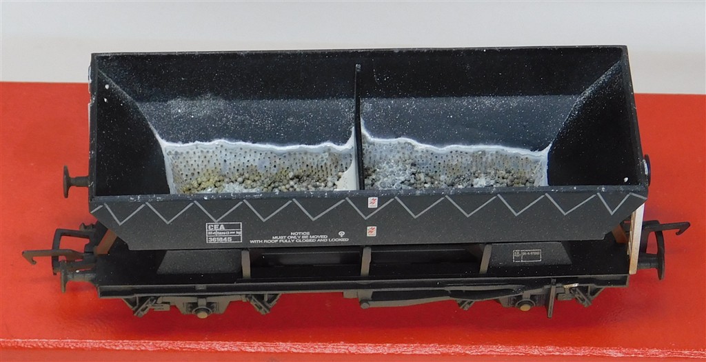 00 Wagons: Bachmann 38-021 covered hopper wagon type CEA number 361845, weathered, added empty load to interior