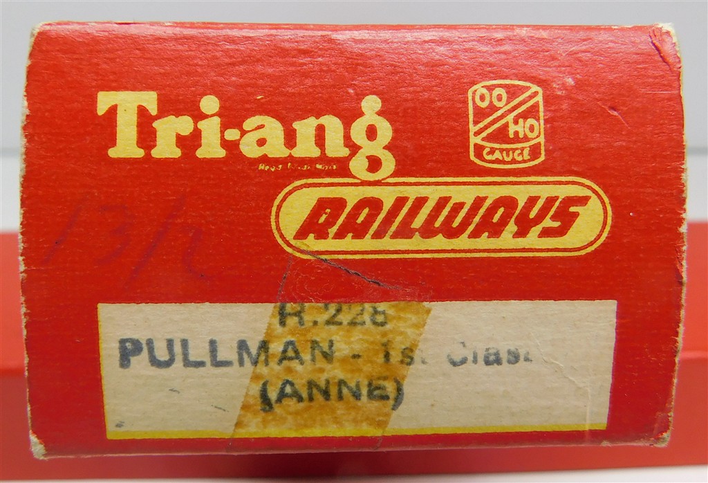 A Tri-ang R228 Pullman car Anne, pink lamp shades, Mark 3 couplings, open axle boxes with deep flanged wheels, grubby roof, in fair condition, supplied in the original box.
