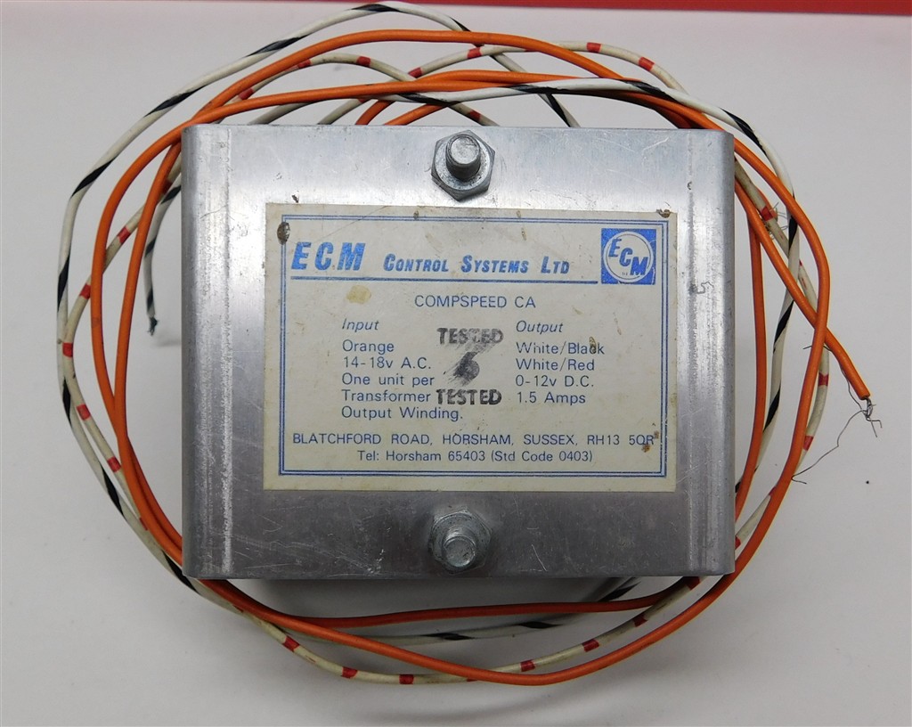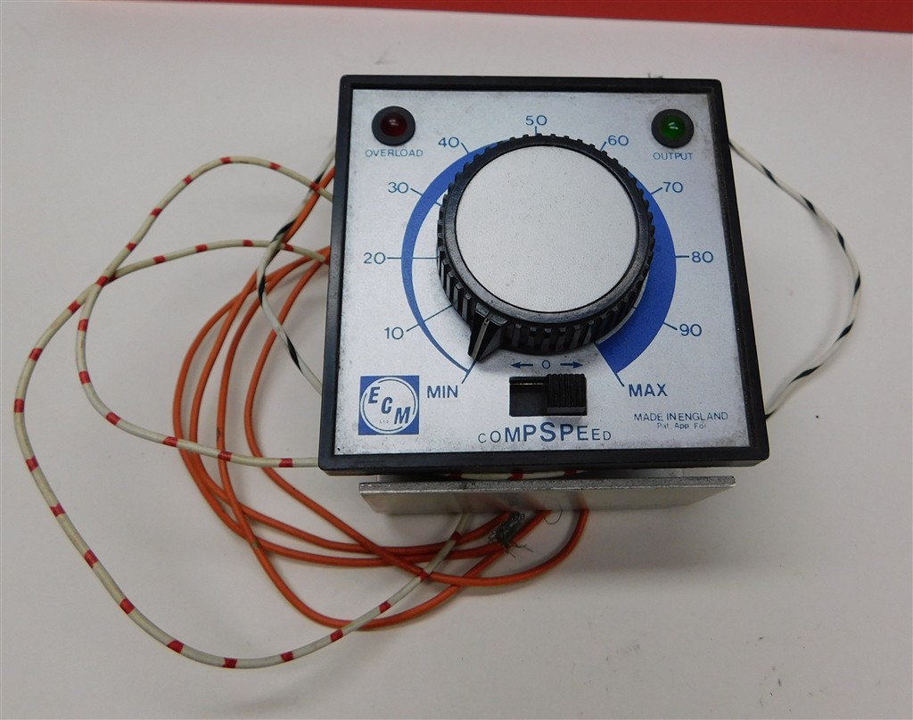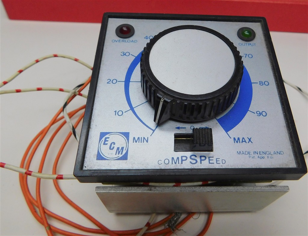 An ECM Compspeed panel mount surface controller, requires 16v AC input from a suitable mains transformer (not included) and installation into a panel, tested and working, no original packaging or instructions. The orange wires connect to the 16v AC supply, the white striped wires connect to the track.