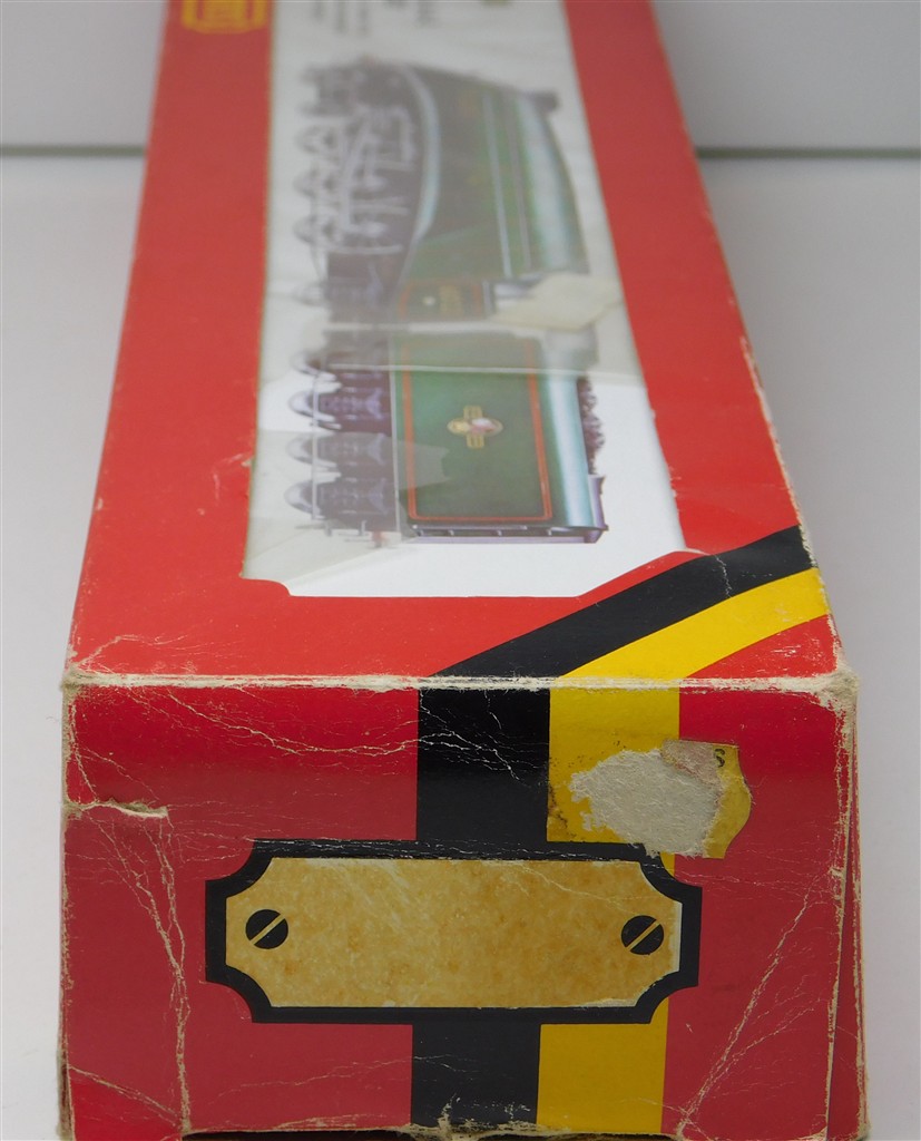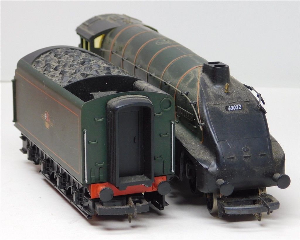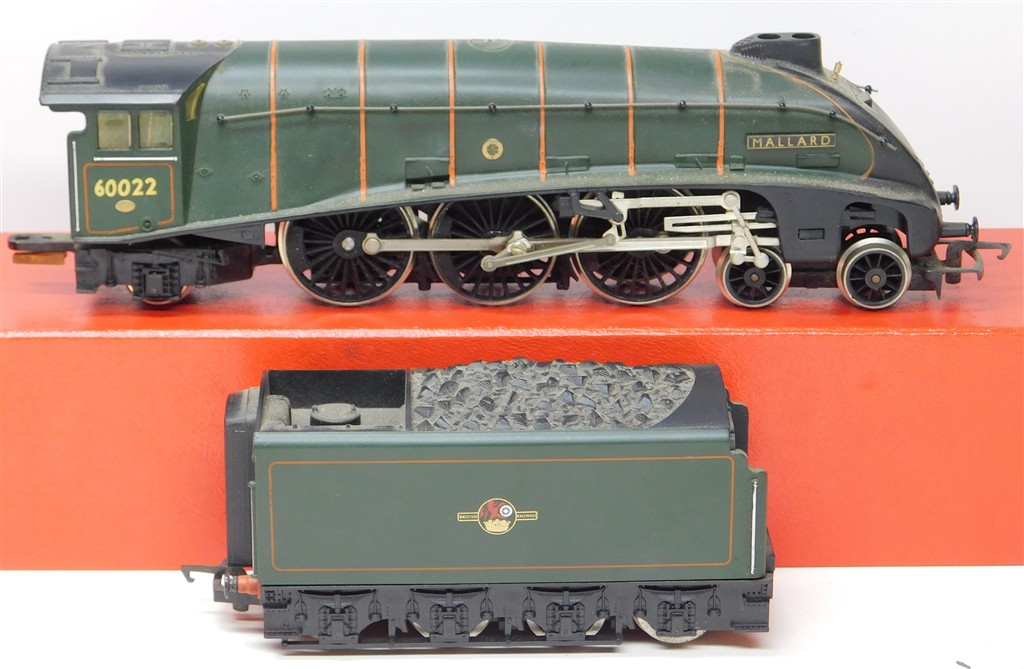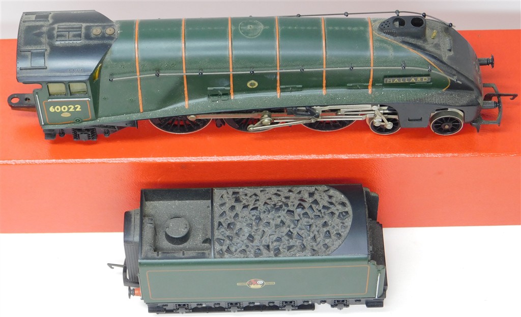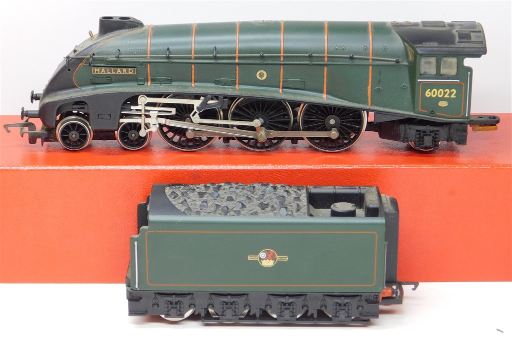 A Hornby tender drive BR A4 number 60022 Mallard, very reluctant runner: motor runs reluctantly when power applied to the wheels and drawbar pin, needs a thorough electrical clean and lubrication, body filthy, supplied in the original box, sold as a project needing work!