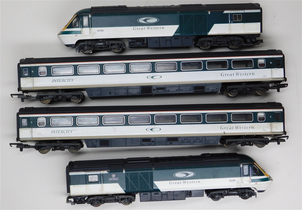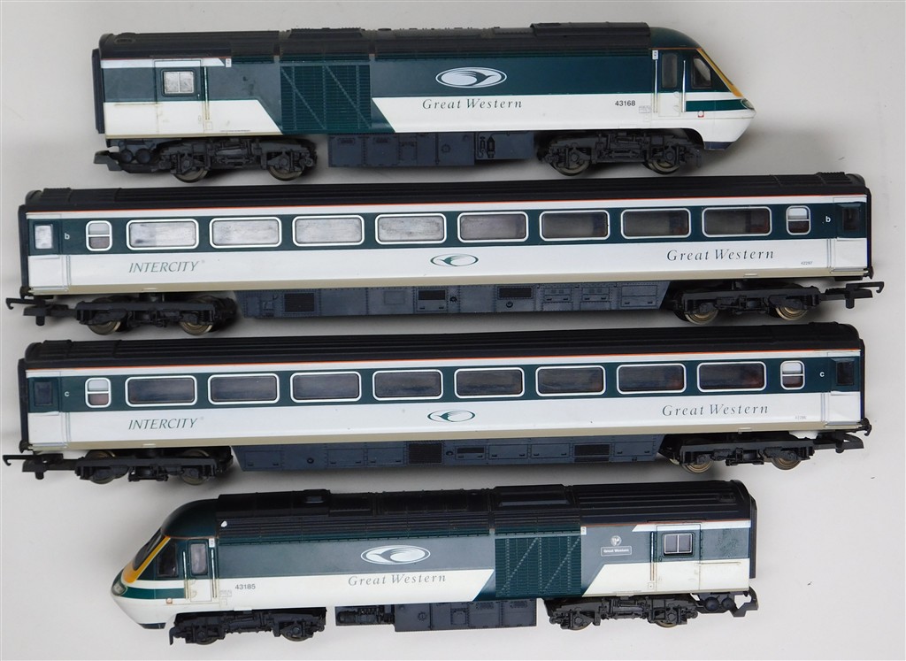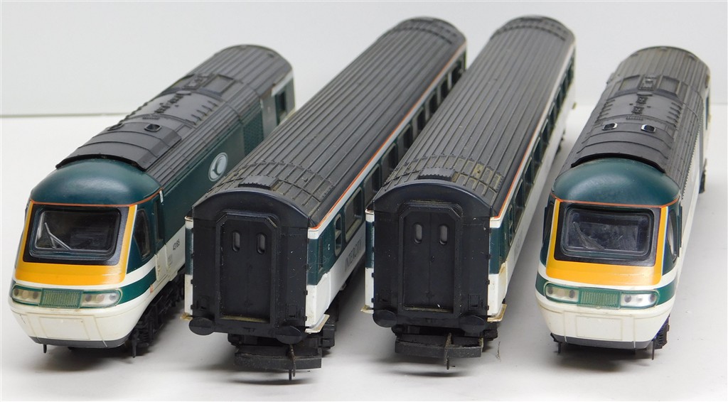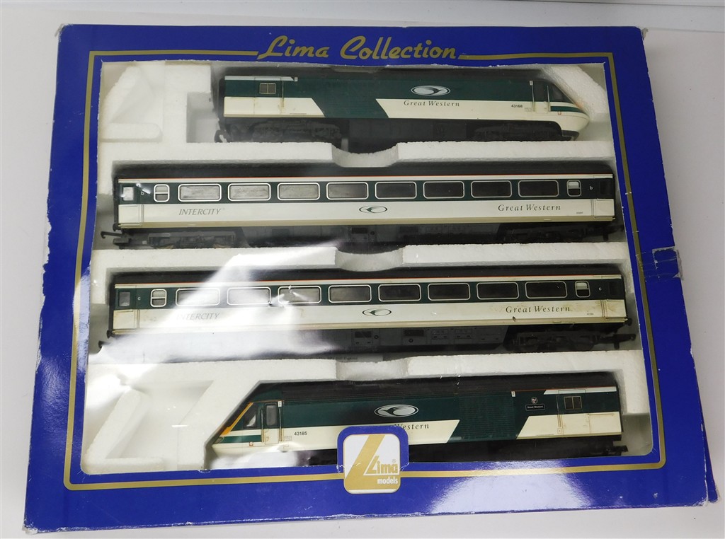 A Lima 149871 4 car First Great Western HST, noisy runner, needs lubrication and adjustments to improve, directional head light in power car, the body shells all need removing and given a good wash in soapy water to remove what appears to be tobacco residue, in good used condition, supplied in the original box, sold as a project needing work