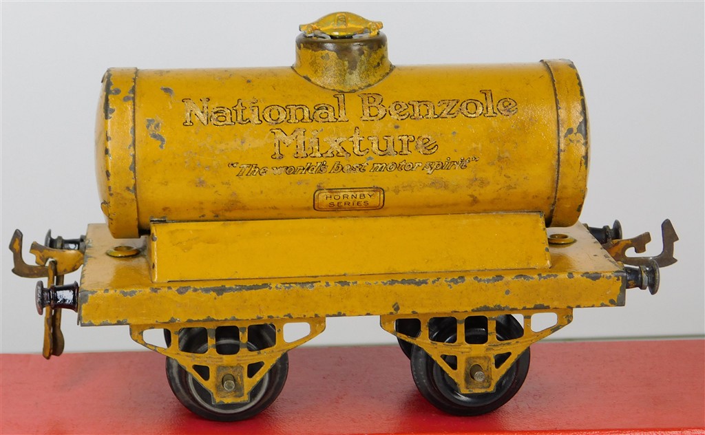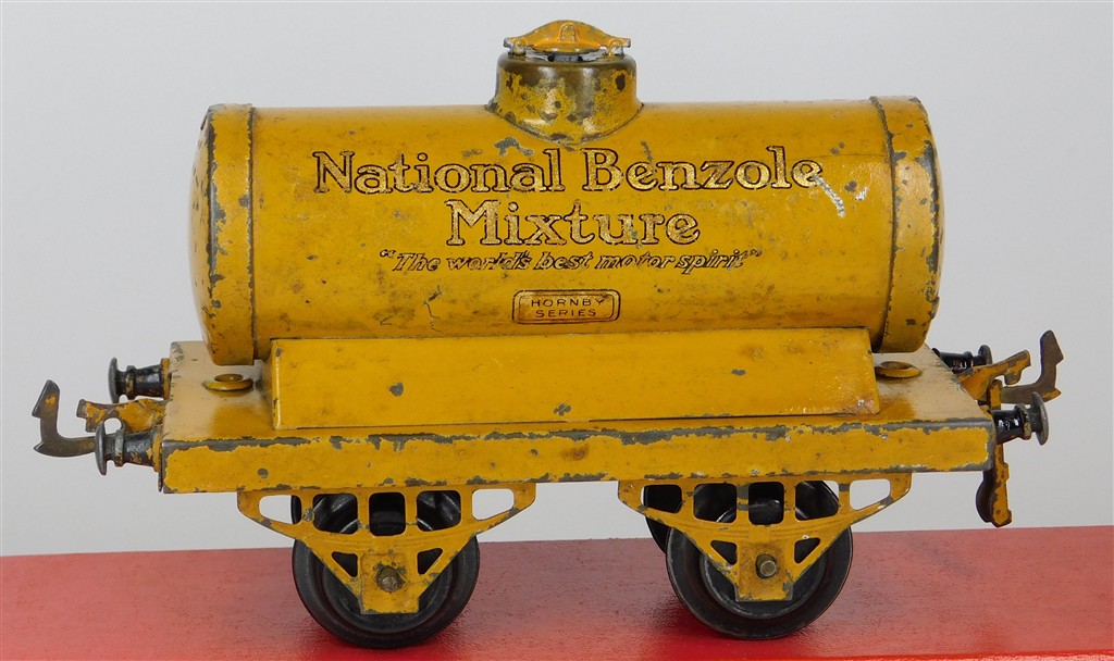 A playworn Hornby O gauge National Benzole tank wagon, type 2 chassis, no original box.