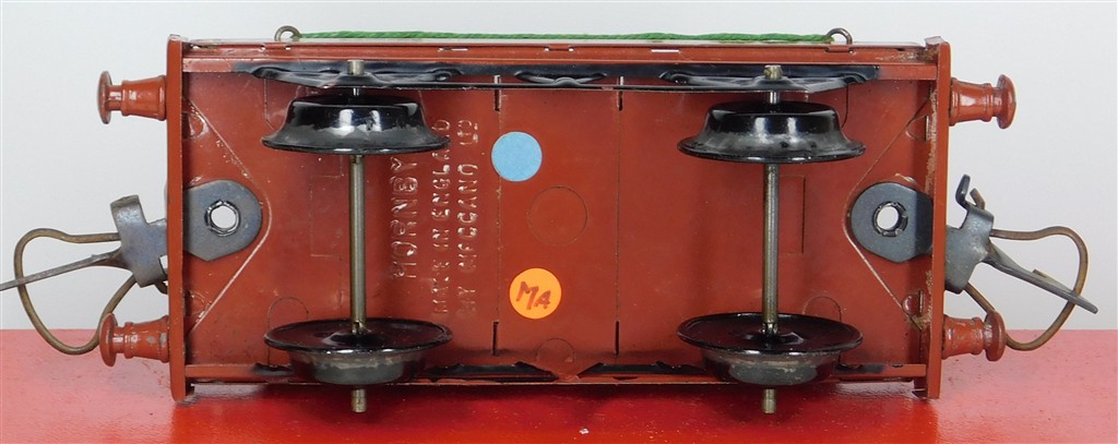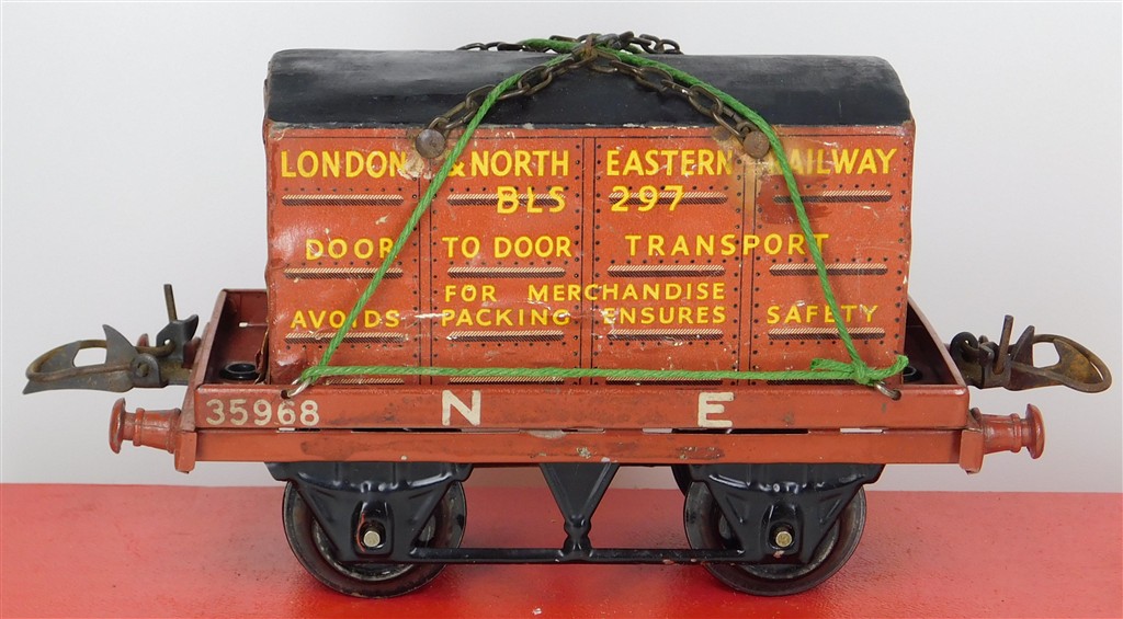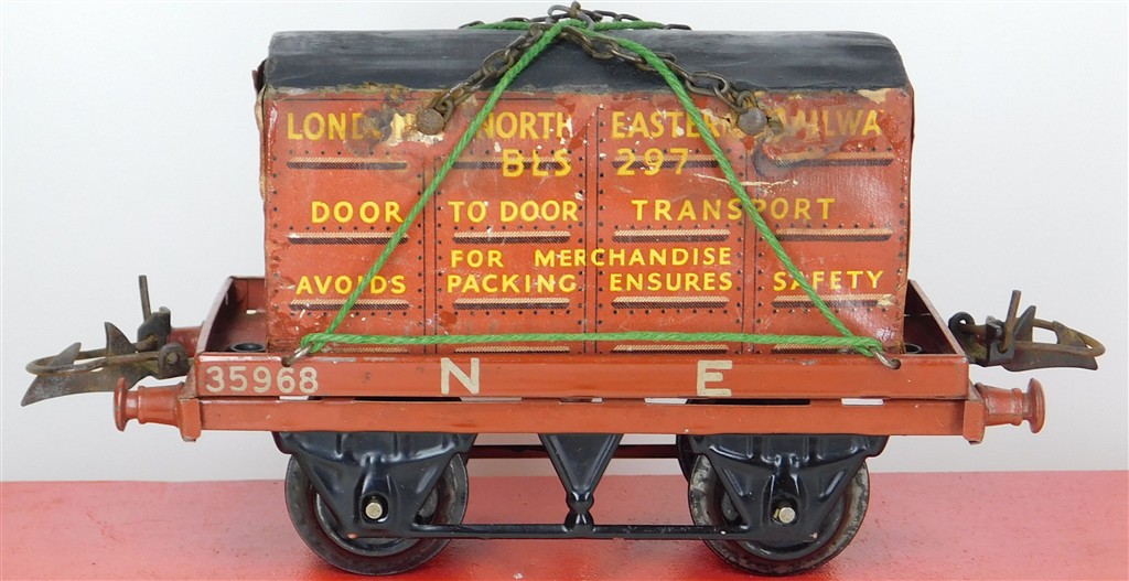 British 0 Gauge : Hornby O gauge NE one plank wagon with container number 35968, brown