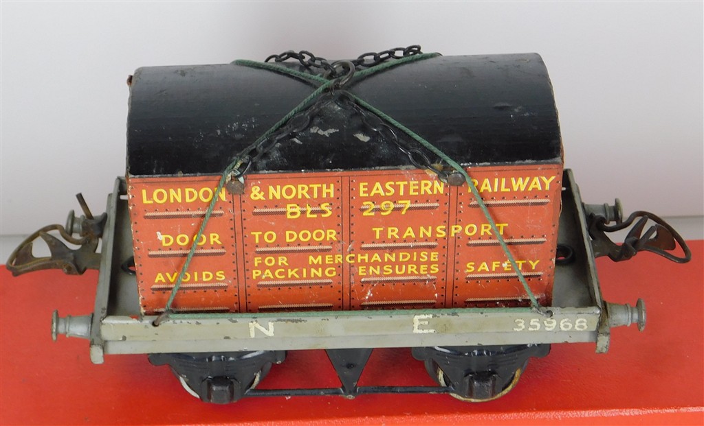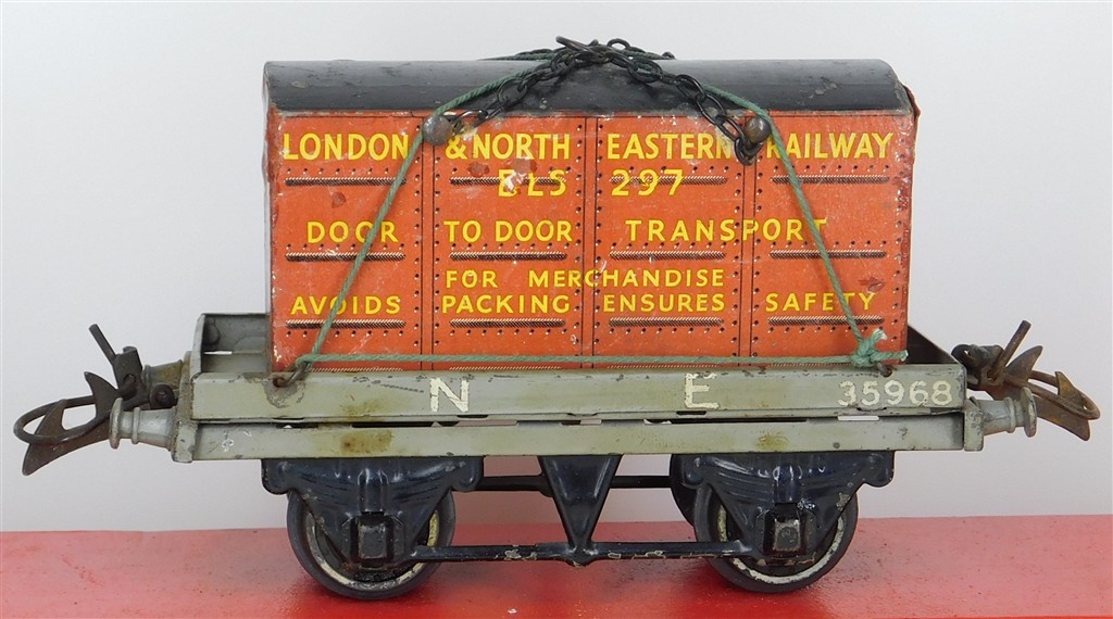 British 0 Gauge : Hornby O gauge NE one plank wagon with container number 35968, grey