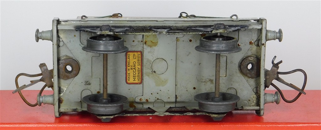 A playworn Hornby O gauge NE one plank wagon with container number 35968, grey, no original box