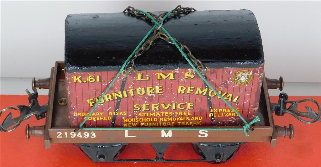 British 0 Gauge : Hornby O gauge LMS one plank wagon with container number 219493, brown