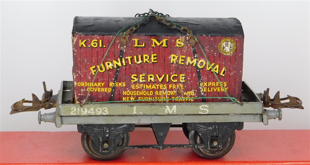 British 0 Gauge : Hornby O gauge LMS one plank wagon with container number 219493, grey
