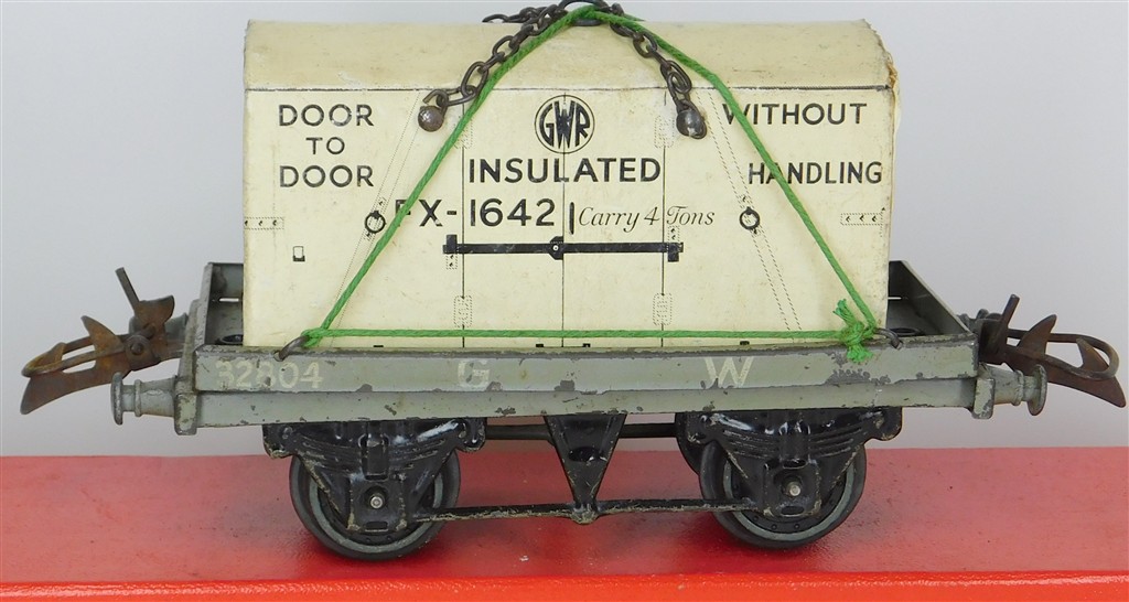 British 0 Gauge : Hornby O gauge GWR one plank wagon with container number 32804, light grey