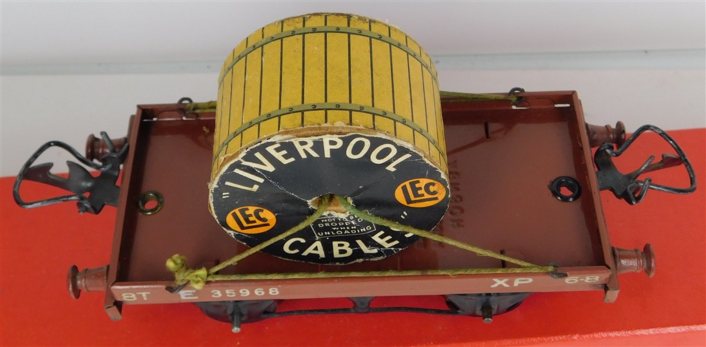 British 0 Gauge : Hornby O gauge BR one plank wagon with Liverpool Cables drum number E35968, brown