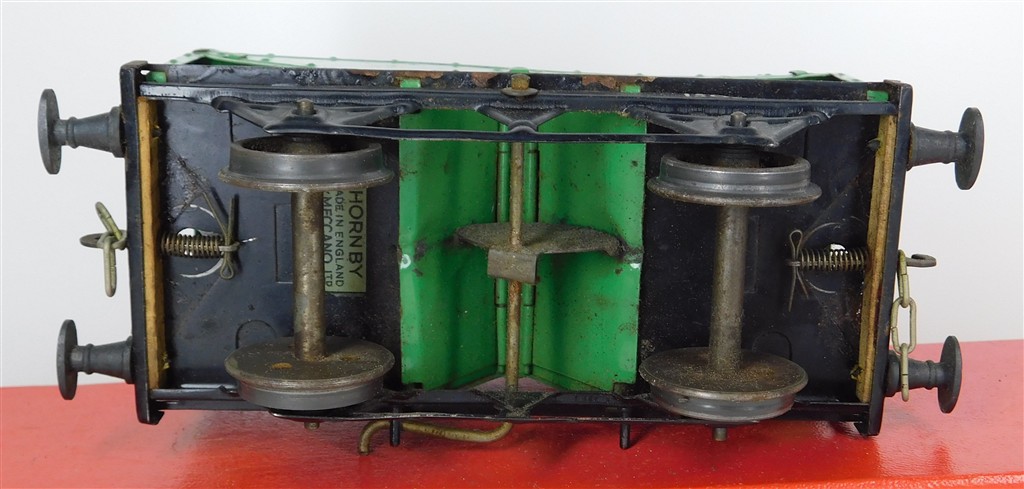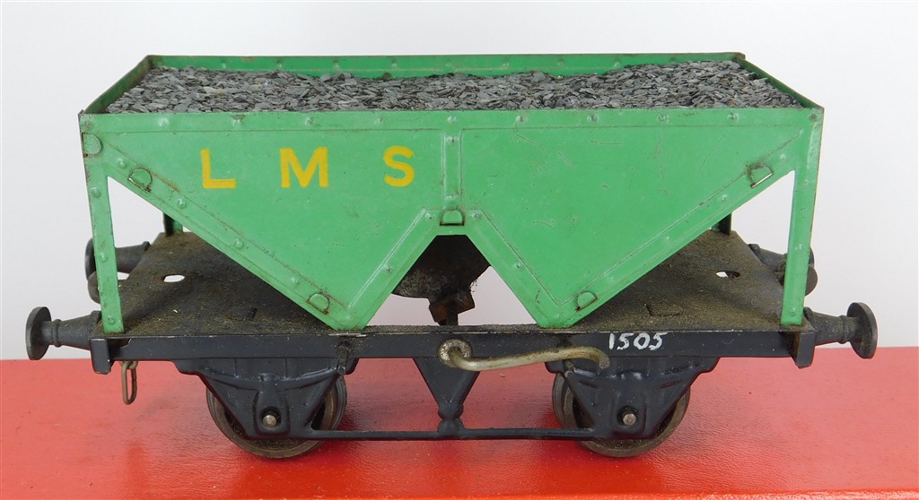 British 0 Gauge : Hornby O gauge LMS green hopper wagon, type 3 chassis, renumbered, 3 link couplings, changed buffers and wheels