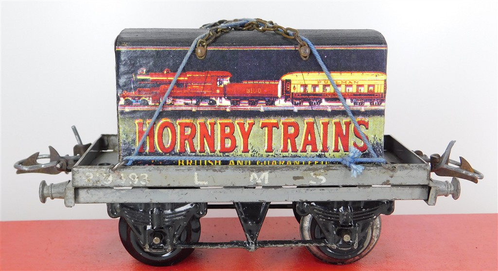 British 0 Gauge : Hornby O gauge LMS one plank wagon with reproduction Hornby Trains container number 219493, grey