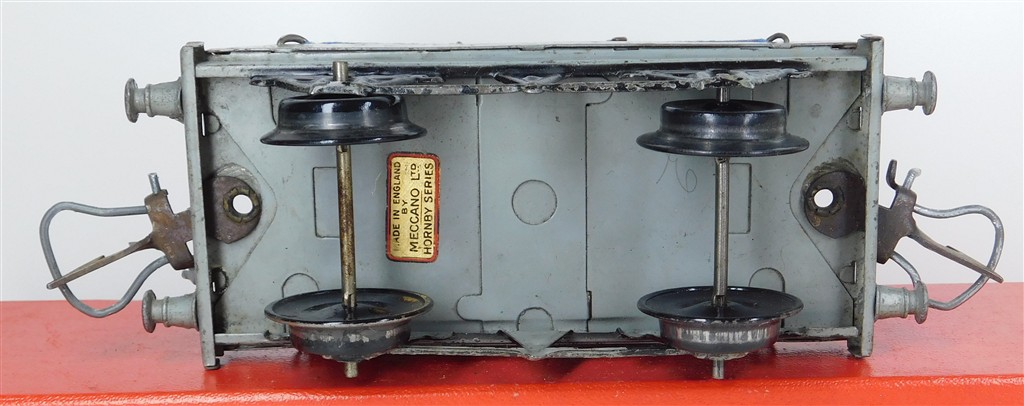 A playworn Hornby O gauge LMS one plank wagon with reproduction Hornby Trains container number 219493, grey, no original box