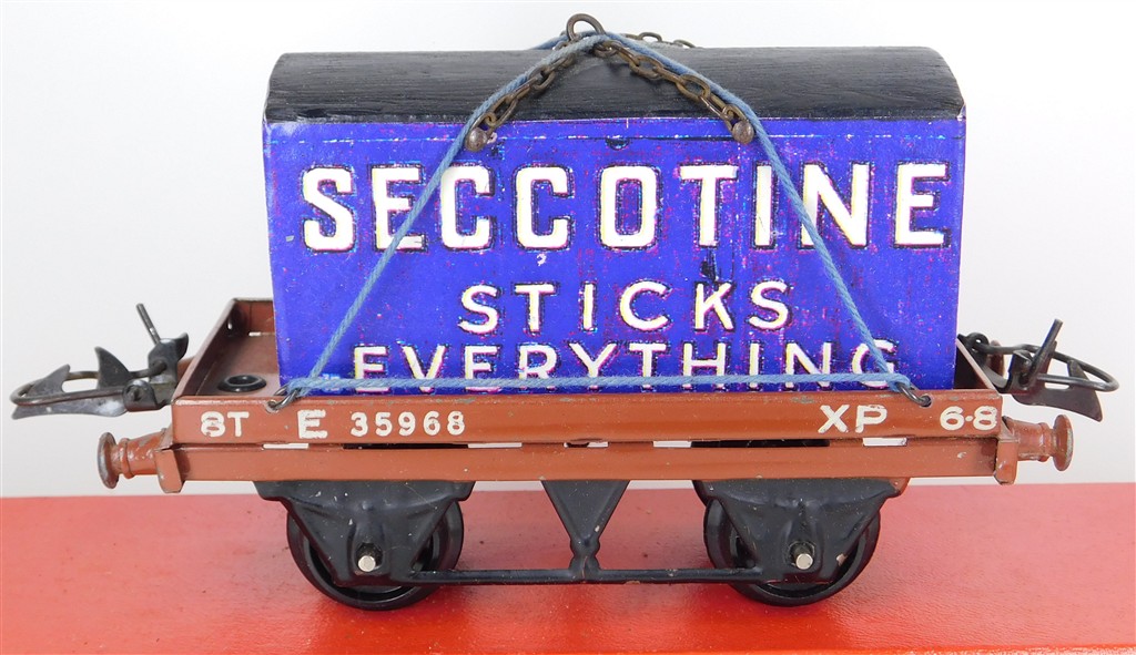 A playworn Hornby O gauge BR one plank wagon with reproduction Seccotine container number E35968, no original box