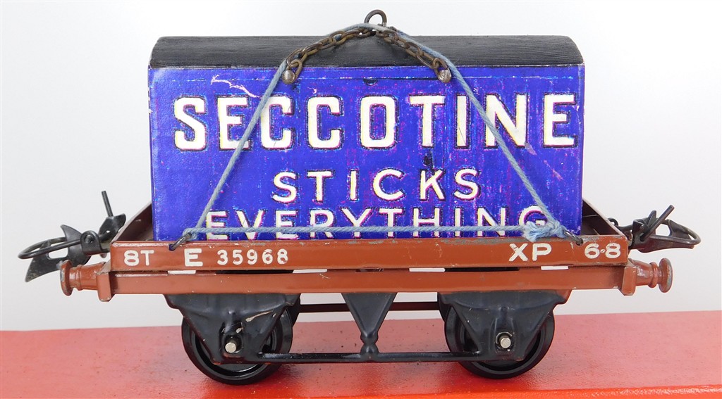 British 0 Gauge : Hornby O gauge BR one plank wagon with reproduction Seccotine container number E35968