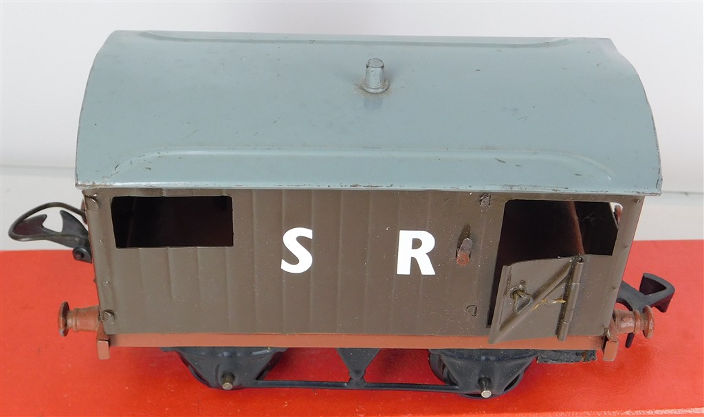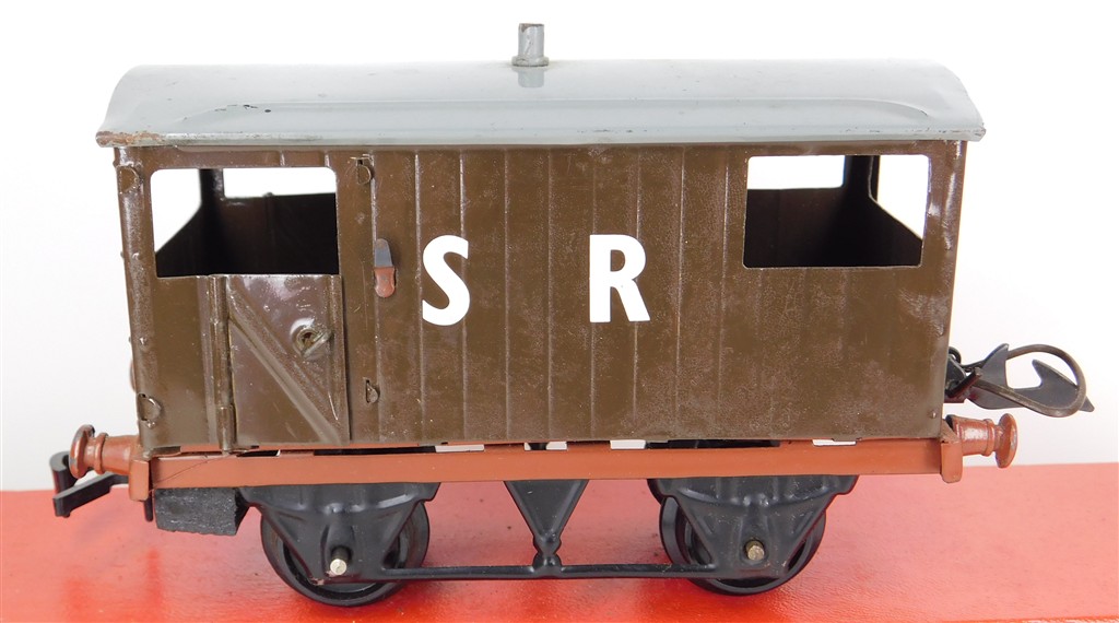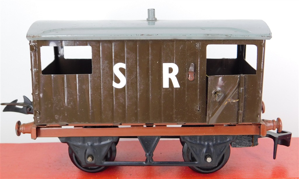 A reasonably well repainted Hornby O gauge SR brake van unnumbered, Tri-ang Big-Big coupling one end, hand lettered, no original box