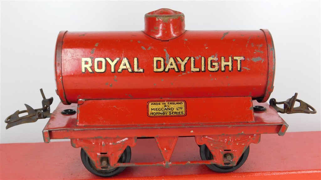 A playworn Hornby O gauge Royal Daylight tank wagon, type 3 chassis, no original box