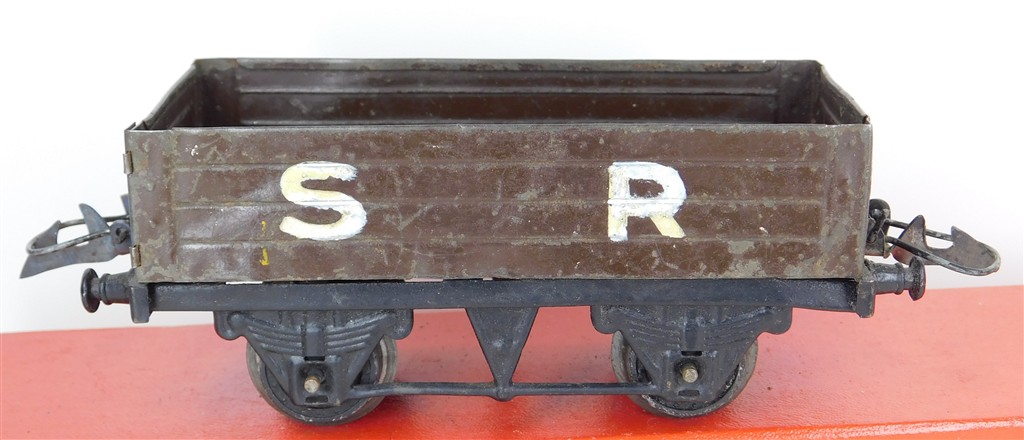 A playworn repainted Hornby O gauge SR open wagon, hand lettered, no original box